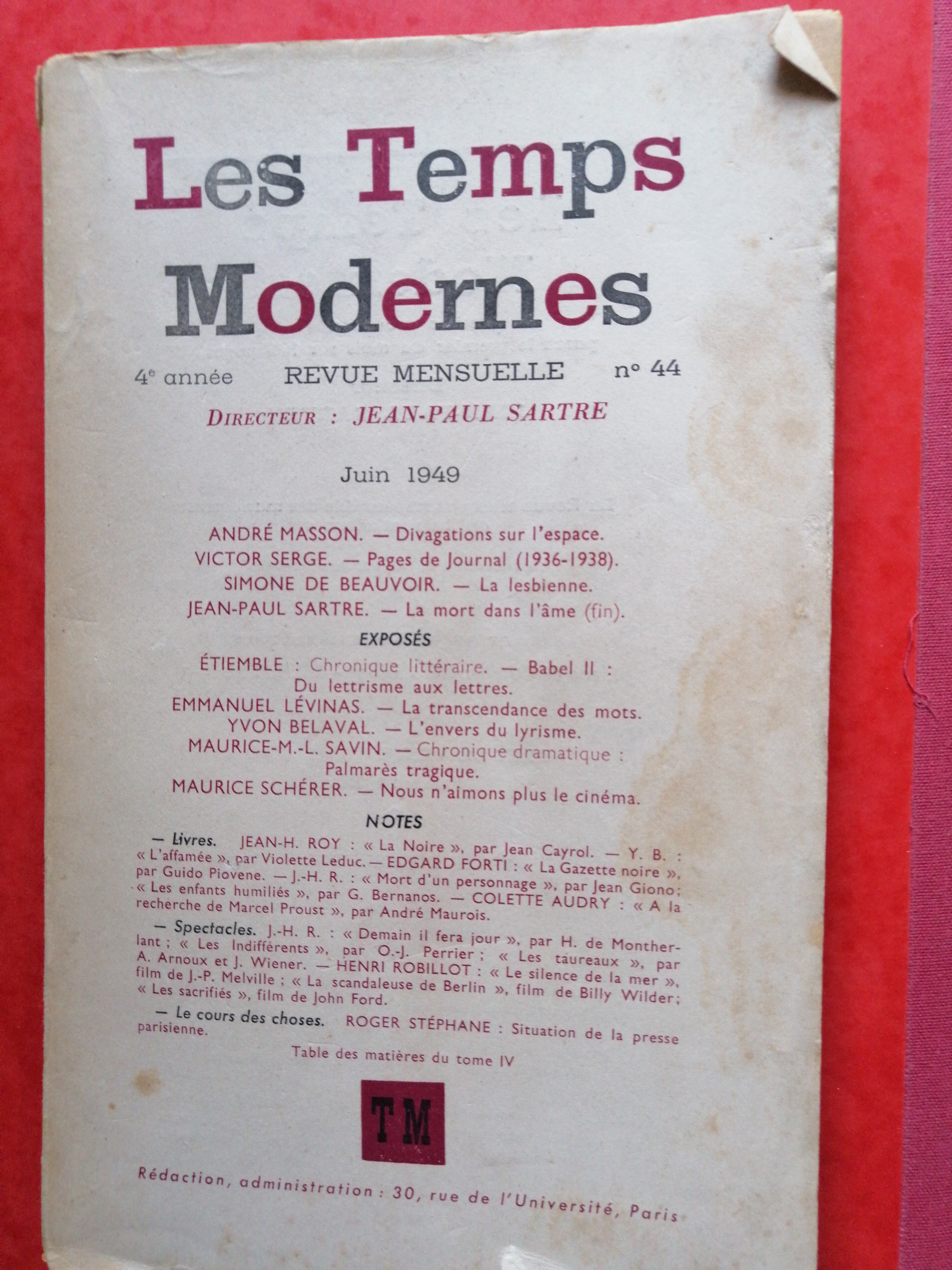 Revue Les Temps Modernes N° 44 André Dubois, membre de l’Association des Ami(e)s de Violette Leduc, a fait don d’un exemplaire du numéro 44 des Temps Modernes dans lequel notre autrice avait publié un extrait de L’Affamée. burst Qu’il en soit chaleureusement remercié! Partager : Cliquer pour partager sur X(ouvre dans une nouvelle fenêtre) X Cliquez pour partager sur Facebook(ouvre dans une nouvelle fenêtre) Facebook J’aime chargement… Similaire